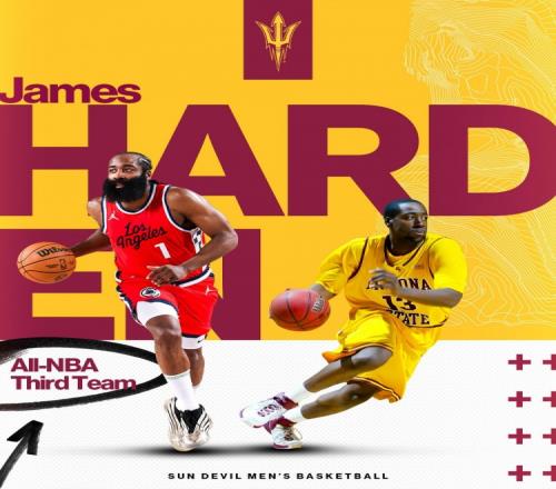 今日哈登的母校亚利桑那州立大学男篮官方晒出哈登海报,并配文:哈登生涯第8️⃣次入选最佳阵容,传奇再攀巅峰