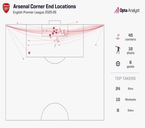 就本赛季而言,阿森纳在前6轮英超比赛中总共获得了45次角球,比其他任何球队都多出至少4次,而赖斯一人就主罚24次。从这些角球中,阿森纳完成18次射正,打进6球。