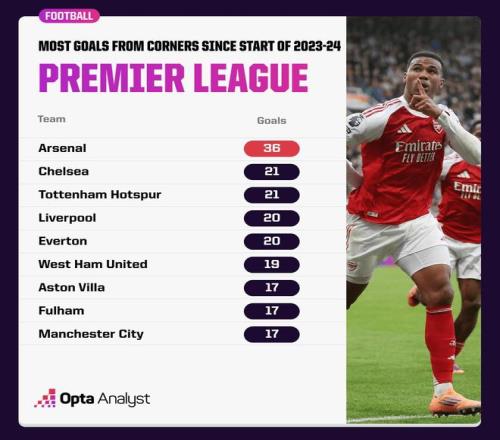 据统计,自2023-24赛季开始以来,阿森纳在英超中通过角球共攻入36球,比其他任何英超球队都要多出至少15球。在这段时间内,只有切尔西(21球)、托特纳姆热刺(21球)、利物浦(20球)和埃弗顿(20球)通过角球打进20+球。