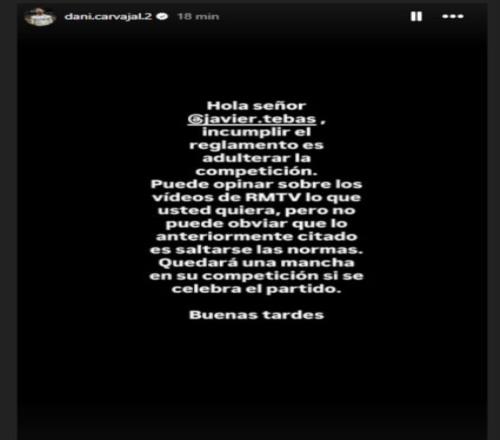 “您好,哈维尔·特巴斯先生。违反规则就是破坏联赛公正性。您可以对皇马电视台的视频内容随意发表看法,但无法否认上述行为已触犯规则。若这场比赛(西甲海外赛)最终举办,将为您的联赛留下污点。下午好。”皇马队长卡瓦哈尔在INS上发布了这则背景为黑色的简短声明,言辞直指西甲联盟主席哈维尔·特巴斯。