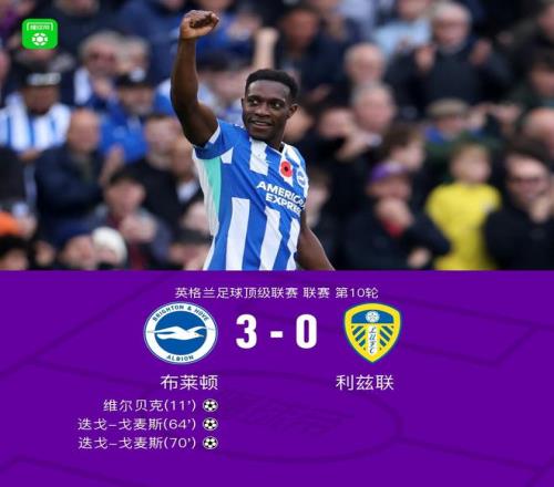 北京时间11月1日,英格兰足球顶级联赛第10轮展开角逐,布莱顿坐镇主场迎战利兹联。比赛中,魏费尔送出精准助攻,维尔贝克冷静破门,为球队首开纪录。随后,迭戈-戈麦斯接队友传球后攻门得手,将比分扩大。比赛后段,扬库巴-明特送出关键助攻,迭戈-戈麦斯再次把握机会完成进球,彻底锁定胜局。最终,布莱顿以3-0战胜利兹联,全取三分。