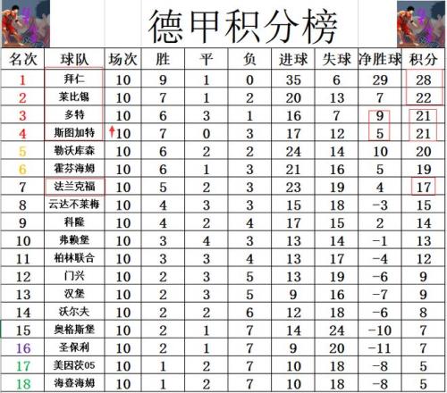 积分榜方面,拜仁本轮被终止了9连胜,不过他们的领先优势还是比较大的,比第2名的莱比锡多了6分,比第3的多特多7分。斯图加特今天逆转绝杀赢球后,超过勒沃库森追上多特,净胜球劣势排在第4。法兰克福绝杀赢球,则是升至第7。