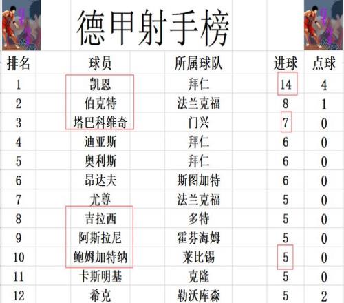 射手榜方面,凯恩14球领跑,伯克特8球位列第2,塔巴科维奇今天无力破门,还是少凯恩7球排在第3。迪亚斯,奥利斯和昂达夫6球并列第4,今天也没有进球的鲍姆加特纳还是和吉拉西等人5球刚好挤入前十。