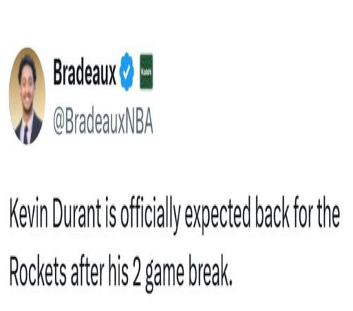 北京时间11月30日,火箭下一场比赛是明日(12月1日)凌晨4点对阵爵士,杜兰特不在球队的伤病名单上,预计将迎来复出。此前他因个人原因缺席了对太阳和勇士的比赛,火箭两场比赛都获得胜利。
