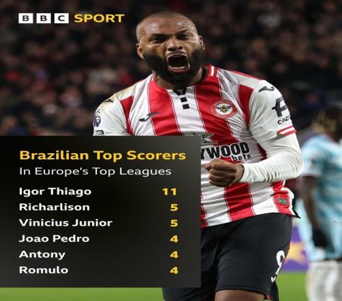 北京时间11月30日,英国媒体节目《Match of the Day》统计出了本赛季至今欧洲五大联赛巴西球员射手榜,本轮英超完成梅开二度帮助布伦特福德主场3-1击败伯恩利的伊戈尔-蒂亚戈以11球断档领先,维尼修斯和安东尼上榜。