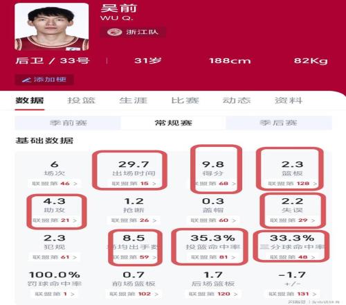 浙江队本赛季的表现如此糟糕,成绩如此惨淡,还有一个关键因素,那就是球队管理层,包括教练团队在内,过分迷信31岁老将吴前。本赛季截止前7轮,吴前场均出场时间,高达29.7分钟(排在全联盟第15位),数据为9.8分2.3板4.3助攻,场均2.2失误。场均出手8.5次,总投篮命中率只有35.3%,三分球命中率33.3%。其得分、篮板、助攻、总投篮命中率、三分球命中率,均创下职业生涯新低。