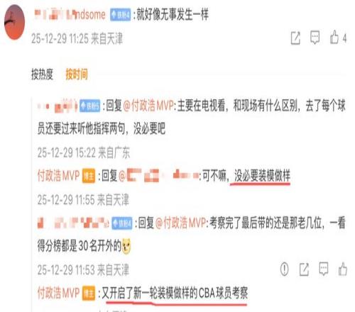 付政浩在和网友互动时直言:“又开启了新一轮装模做样的CBA球员考察”,并且一针见血指出:“郭导已经黔驴技穷,早点下课,回到CBA找个中下游球队好好抓训练抓防守继续当名帅吧。别再祸祸国家队了,国家队连续输给韩国,这是在砸所有中国篮球人的饭碗,一举把中国篮球的商业价值全干崩了。放过中国篮球吧。