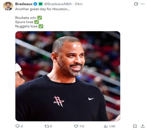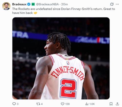 火箭记者Bradeaux感谢芬尼-史密斯,因为史密斯复出的两场比赛火箭队都赢球了。