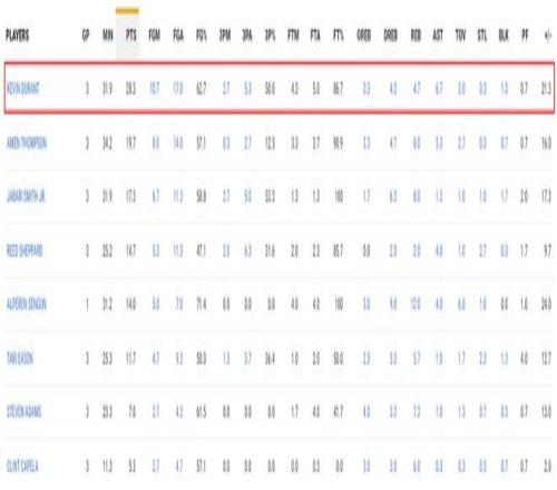 37岁的杜兰特场均36分钟,拿到25.4分4.9篮板4.3助攻0.8抢断1盖帽,命中率54.6%,三分命中率44.2%,罚球命中率89.8%,只差罚球0.2%就完成了180俱乐部,这个表现差?