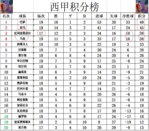 积分榜方面,皇马主场大胜后,依然是4分的差距紧咬巴萨排在第2。马竞今天无力击败皇家社会,这样的话他们就无法超过少赛2场的比利亚雷亚尔回到前3。惨败的贝蒂斯同样无法缩小和西班牙人的差距,还是差了后者5分排在第6。