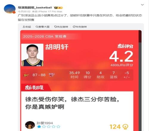 这场比赛广东后卫胡明轩与徐杰的表现有着巨大的差距,徐杰加时赛+末节合计拿到6分,而胡明轩在末节+加时合计拿2分,胡明轩加时赛打满5分钟沦为逆天‘拒投’0出手0分0篮板0助攻0抢断0盖帽0犯规。