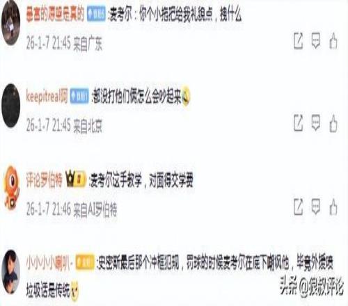 媒体人赵探长发文点评:“麦考尔这表情,有点教育小老弟的感觉,狠绝色啊”。