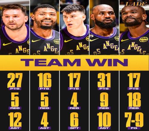 此外,这场比赛湖人全队的状态都有所回暖,投篮83投48中,命中率57.8%,三分球34投19中,命中率55.9%。全队5人得分上双,詹姆斯31分9篮板10助攻1抢断1盖帽,东契奇27分5篮板12助攻,艾顿17分18篮板,拉拉维亚17分4篮板3助攻,斯玛特16分5篮板4助攻,文森特10分1篮板1助攻,正如湖人名宿罗伯特·霍里在赛后所说:“这场比赛很好地展现了湖人如果能转移球、不依赖单打独斗时能做到什么,这就是为什么这被称为团队运动。转移球,让每个人都参与进来。”